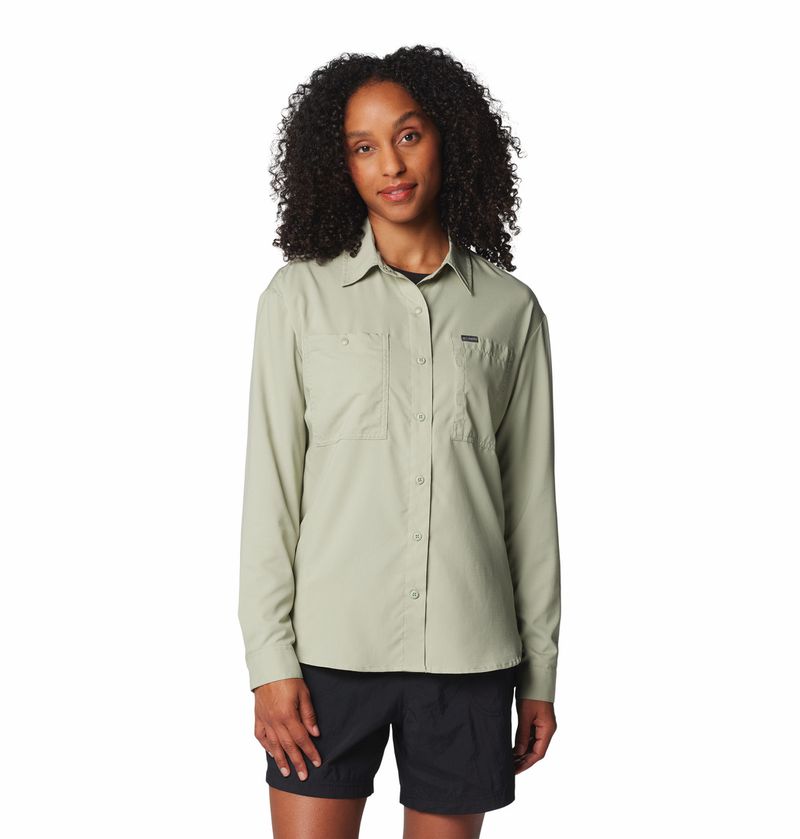 Blusa Para Mujer Manga Larga Silver Ridge™ Utility Verde Columbia.Te esperan senderos soleados. Estas versátiles blusas de senderismo cuentan con protección solar UPF 5, tejido que absorbe el sudor, neutraliza los olores y rejillas de ventilación de malla transpirable para comodidad durante todo el día. Aventúrate más, preocúpate menos.